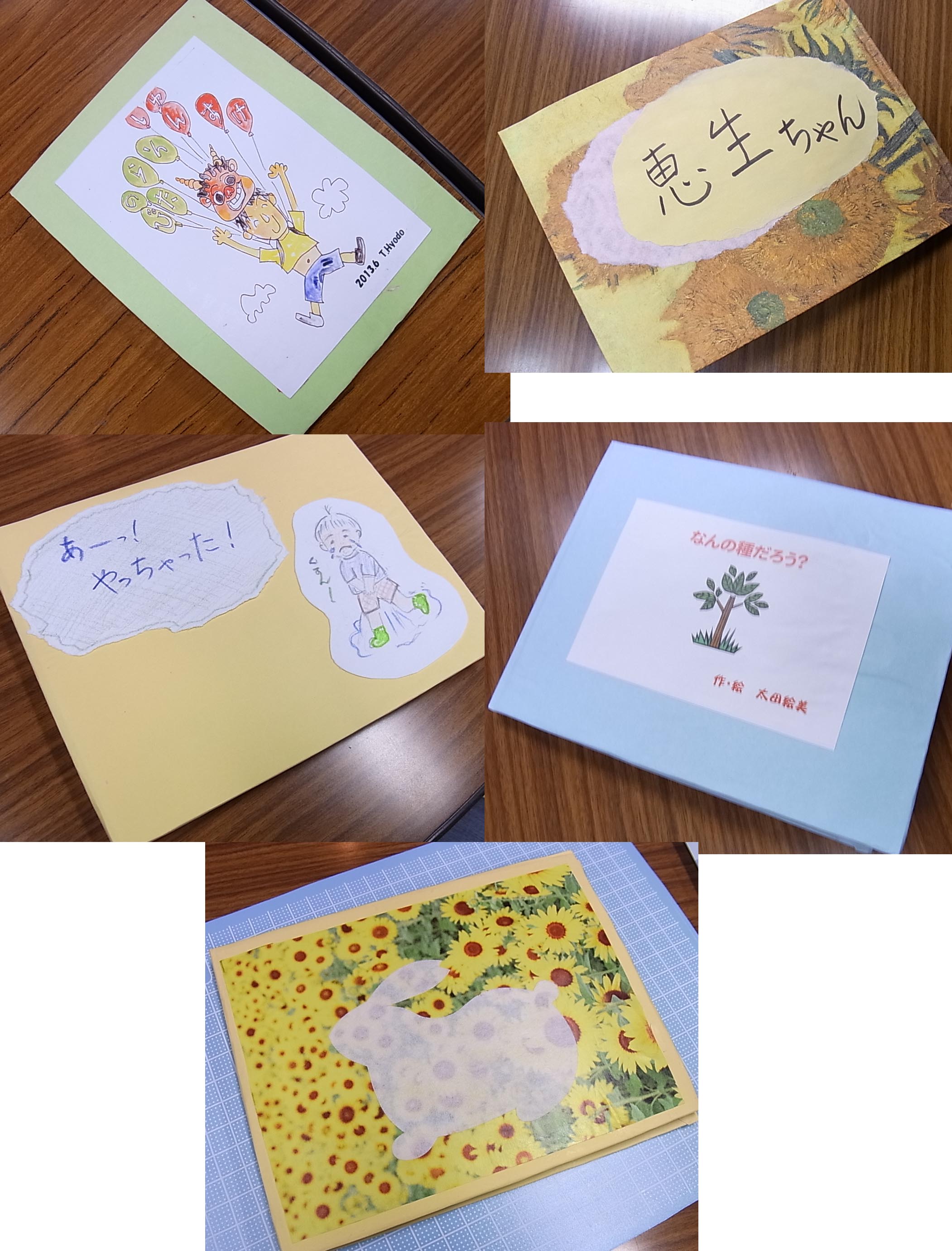 心配だったのは、前回の宿題「お話を書いてくる」「絵、もしくは写真を用意してくる」をできなかった人、持ってくるのを忘れた人がどれだけいるか、ということでしたが……大丈夫でした! 文章がまだ途中という方はいましたが、充分フォローできる範囲内。また、ストーリーは用意してきたけれど、絵が用意できなかったという方もいましたが、スタッフの中に絵の上手な方がいて、イメージを聞き出しながらその場で描くという大活躍をしてくれたので、こちらもなんとかなりました。 前回は講義が中心だったのですが、今回は作業が中心。手順を写真付きで説明したプリントを配り、その場での説明も付け加えながら、作業を進めて行きます。 私が説明を交えながら、実際に作るようすが映し出されます。これにより、各テーブルを回っての説明が大幅にカットされました。ものすごく助かります。 作業の進み具合には、当然のことながら個人差があります。今回は、早い人にはどんどん作業を進めてもらう方式をとりました。 こうしたワークショップで、トラブルはつきものです。ページのつぎ合わせ方を間違えた、写真の順番間違えて貼ってしまった、あとで表紙と本体を合体させるときに糊付けする面を扉にしてしまった等々。 どれも一大事ですが、現場で、どうしたら解決できるかを考えるのも、なんだか楽しかったです。「役立ってる」という実感があります(笑)。 幼児向けの絵本にした人、孫のためのアルバム風にした人、ポエムにした人、縦開きにした人……。どれもこれも、オリジナリティに溢れる作品でした。 マイクも据えて、絵本を画面に映し出しながら朗読をしてもらいました。 どの作品も、とてもおもしろかったです。講評をしたのですが、どんなコメントをしたらいいか悩むような作品はひとつもありませんでした。 どうなることか心配したワークショップでしたが、みなさん、笑顔で帰ってくれたのが嬉しかったです! ご協力くださったスタッフのみなさん、本当にありがとうございます! 私ひとりでは、受講者のみなさんに笑顔を持ち帰っていただくことができなかったかもしれません。みなさんとチームを組めたことに、感謝しています!