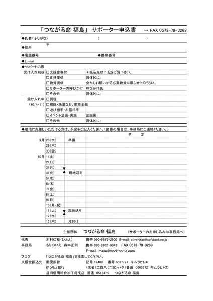 放射能に不安を覚えつつも、福島で暮らしている母子を、1週間、加子母に招いて、気持ちをリフレッシュしてもらおうという企画です。 来月4~11日の企画ですが、7日の夕方、会場の加子母で、つくも堂まめ本舗のワークショップを、夕方から開講します。参加者は福島のお母さんと子どもたち、そして加子母の子どもたち、といったところでしょうか。 福島では不安を抱えながらの生活でしょうが、豆本作りを覚えて、少しホッとしていただけたらと思います。 この企画では、サポーターを募集しています。物資や食料、金銭面での援助をして下さる方、どうぞよろしくお願いいたします。 以下、サイトからの貼り付けです。 「つながる命 福島」サポーター大募集!!! 「福島の母子、加子母(かしも)でリフレッシュ!!」 【サポーター募集!】 3月11日以降、 放射能汚染に不安を感じながら暮らしている母子・妊婦さんに、 「岐阜県の山村『加子母(かしも)』で滞在して、 心と身体をリフレッシュしてもらおう!」 というアクションを起こしました。 つきましては皆さんのサポートをぜひお願い致します。 福島の方は、今私達があたりまえに生活していることができずに、 心にいろんな思いを抱えています。 たくさんの方々に助けて頂く事で、輝く命があります。 送迎の交通費(約40万円)、約1週間の滞在費(約30万円)など、 多額の資金が必要です。 支援金や物資、食材などのサポートをお願い致します。 どうぞ皆様の愛と行動をお待ちしています!!! 【お願いしたいサポート】 ● 食事を作って下さる方(福島の方も一緒に作ってもらいます) ● お母さんの話し相手になってくださる方 ●子どもと一緒に遊んでくれる方 ●看護師免許を持っている方 ●イベントを行ってくださる方 ●必要なお金や物資・食材などを支援して頂ける方 ●支援金や物資などを集めるよう、動いて下さる方 ●事前準備の話し合いに参加して頂ける方などなど ○ 支援金振込先 ・益田信用組合加子母支店 普通 0513475 つながる命 福島 ・ゆうちょ銀行(店名)二四八(ニヨンハチ)普通 0663772 キムラヒトエ ・郵便振替 記号 12480 番号 6637721 キムラヒトエ 詳しくはこちら。 http://tsunagaruinochifuku.blog.fc2.com/blog-category-3.html