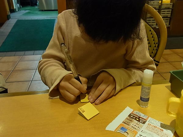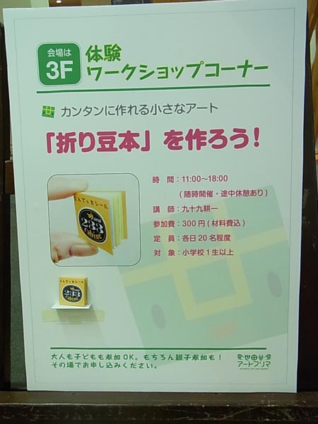 初日と違って、朝からいい天気。これは忙しくなるぞー、と思ったのですが……私のブースのお客さんは、前日と同じくらいでした。……これは、私の失敗のせいでもあります。 材料が17時前に尽きてしまいました! 参加できなかったみなさん、本当にごめんなさい! こちらの参加者さんは姉妹。お母さんもサポーターとして参戦! ふたりとも、きれいな豆本が作れました。 こちらの子も、真剣な眼差し! 所要時間はだいたい15~25分ですが、低学年の子の中には、ハサミで用紙を切ったところで集中力が切れ、折っていく段階ではかなり雑になってしまう子が何人か見られました。 手直しすると「自分で作った」という感じが薄れてしまいますし、プライドが傷つく子もいます。なので、合間合間に「今、何年生?」とか、「工作は得意?」などの質問をして、ガス抜きをすることが必要だとわかりました。 また、褒めすぎるのもよくないようです。低学年の子に多く見られた傾向ですが、ハサミを使っているときに「おっ、うまいね! すごくきれいに切れてる!」という具合に褒めると、どうも張り切りすぎてしまうようです。「いいところを見せよう!」と思うのか、ハサミのスピードが上がり、それまでまっすぐ切れていたのに曲がってきてしまう子が、何人かいました。 なので、作業中はあまり褒めず、「うん、いいよー」くらいに留めておくことにしました。作業が終わってから褒めると、集中力が途切れることを少し防止することもできるようです。 うーん、ワークショップやると、学べるなー。 前の日記にも書いたことですが、世田谷233は、世田谷アートフリマで中心になって動いているボックス・ギャラリーです。このバナナシールは、そこのオリジナル。 「このシールはね、どんなに八百屋さんを探して回っても、ぜったいに見つけることができないんだよ。ここでしか手に入らないシールだよー」と言うと、子どもの顔がパァッと嬉しそうに輝きます。レア感が嬉しいのでしょう。 ウソは言ってませんが、このシール、「別企画の余り物」という言い方もできたりします。 ……まあ、ものは言いようってことで。 前日のお客さんから学んだことですが、ビニールケースにカッターでチャチャッと穴を開け、「はい、ミニミニ手提げ袋」と言って渡してみました。これが子どもにけっこうウケがよく、穴を指先でつまんで、スキップして帰る子もいました。10秒足らずの細工で、こんなに喜んでもらえるとは! ホント、ワークショップをやると、勉強になります。 近日、ポラン書房にも納品します。 ポラン書房は、こちらです。 http://www5d.biglobe.ne.jp/~polanet/ PR 今日はアートフリマ初日。昨晩は3時近くまで準備をしていたので、ちょっと眠かったです。 家を出るとき、雨は降っていませんでしたが、電車に乗ってしばらくしたら土砂降り……。「お客さん、来るんだろうか?」と不安を抱えつつ、三軒茶屋・キャロットタワーへ。 一応、豆本の販売もしてみた。 さて、ワークショップ。フタを開けてみると、お客さん、来てくれました! 今日は全部で22人。子どもも多く、がんばって作っていました。 「切る」という作業よりも、「折る」という作業のほうが難しいようです。これは、子どもに限ったことではありません。 蛇腹折りは、慣れないと、けっこうズレが出てきます。なので今回は「大きく折って、じょじょに小さく」という作戦をとってみました。帯状の用紙を、まず半分に折り、四分の一に折り、八分の一に折り……という具合に。なるべく誤差を少なくできるように。 お客さんのひとりがクリエイティブな方で、この袋にカッターで穴を開け、ミニミニ手提げ袋に! うーん、写真じゃちょっとわかりにくいけれど、けっこうかわいかったです。ナイス・アイディア! 豆本もちょっと売れまして、それは嬉しいのですが、やはりひとりでは手が足らないなー、という感じです。 明日は今日よりずっとお客さんが増えるそうなので、がんばらねば! 今回はワークショップの内容を新しくしたので、ちょっとキンチョーしています。 今回作る豆本はこちら。 ワークショップだけでなく、販売も少々。新作もあります。 コルクン族がお菓子の家を作るお話。折り本形式の豆本です。 「別館ポラン書房」シリーズの第2巻『たぬき和尚』。こちらはドールハウスサイズ。 「なんで2巻が今ごろ?」という疑問を抱く方も多いでしょう。まあ、なんと言いますか……早い話が怠けてたんですね(汗)。 カバーのデザインがまだ決まっていなくて、写真は仮のデザイン。これから直して、明日になんとか間に合うようにしまーす! みなさん、よかったら遊びに来てください! 今回のワークショップで作る豆本は、こんな感じです。 より低学年の子も参加できるようにと思い、帯状の中身を蛇腹に折って作る形式にしました。 テキストはすぐに用意できましたが、問題なのは教え方。自分にとってカンタンにできることでも、他の人