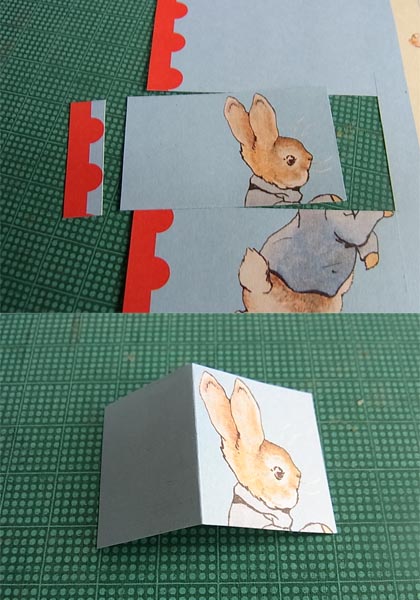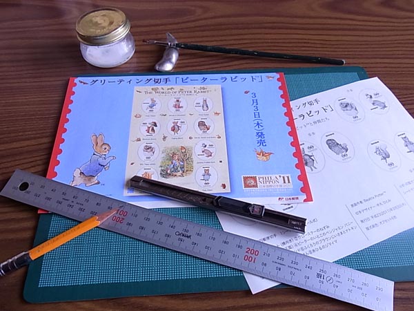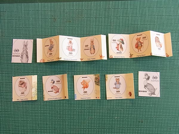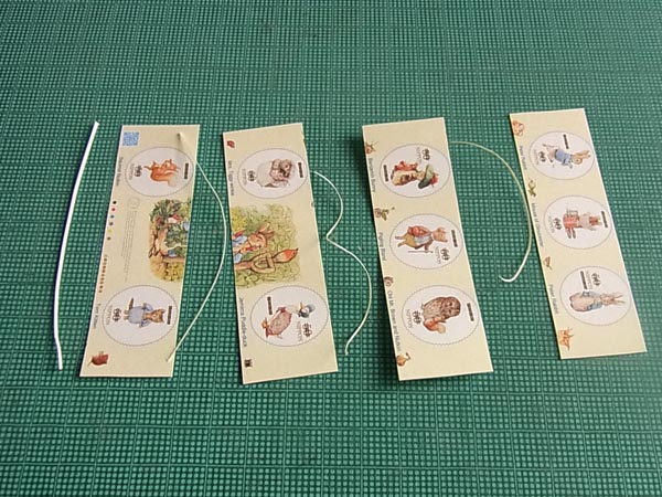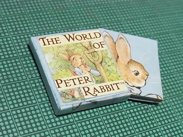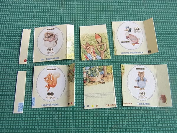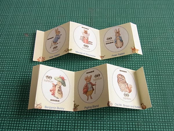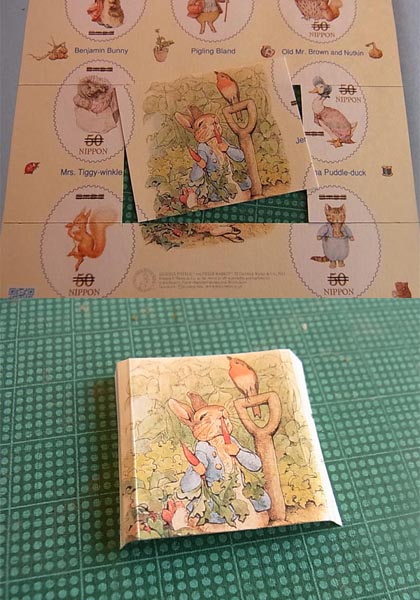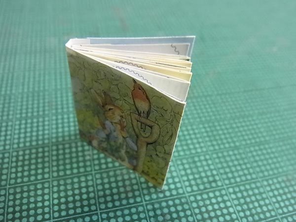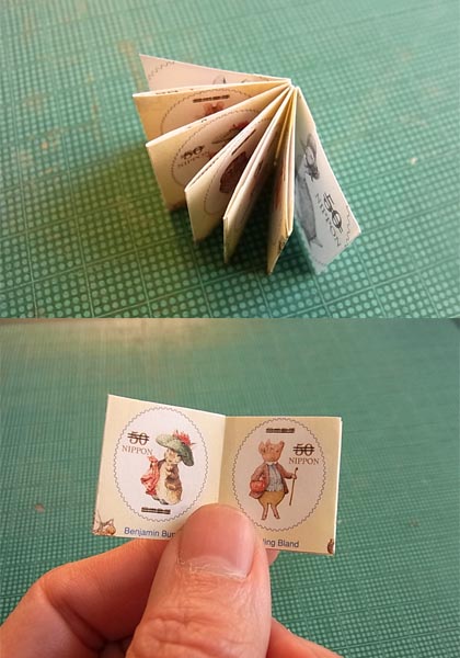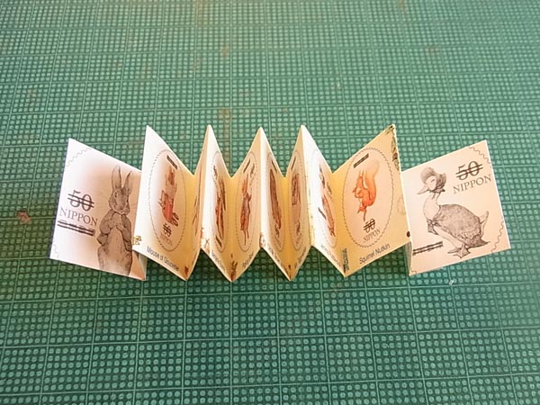 × [PR]上記の広告は3ヶ月以上新規記事投稿のないブログに表示されています。新しい記事を書く事で広告が消えます。 今回は50円切手シートで豆本を作っていきます。チラシは2枚、使います。 1.チラシ中央を切り取る 後は、中央の黄色い部分を切り抜きます。水色の部分も後で使うので、切り目はなるべくはみ出さないようにしてください。 2.本体用の絵を切る 高さは26mmにするとちょうどいいでしょう。 3.折る 絵を中央に据えて、幅23mmで折りましょう。 切る位置ですが、左側は、折り目のやや内側を。右側は折り目から5mmの幅を取って。 4.白黒の絵を切り抜く 私は左下のピーターラビットと、右上の「あひるのジマイマ」を切り抜きました。好みで選んでくださってけっこうです。ただし、まだ切り抜いていない、2枚目のチラシから選ぶときは要注意。先に切り抜いてしまうと、後から表紙を作れなくなってしまうことがあります。 切り抜く大きさは、縦26mm、横23mmです。 5.パーツを並べる 足りないパーツがないか、よく確認してくださいね。 6.パーツを貼り合わせる このときに、山折り、谷折りが逆になっているパーツがあったら、直してください。 折り目はきつめに、しっかりと。 7.背をのり付けする 「背」というより、内側にボンドが入り込むくらいに塗ってしまってかまいません。ここで言う「内側」は、あくまで裏面のこと。表面にボンドが付くと、汚れたり、最悪開かなくなったりしますので、ご注意を。 これで本体はできあがり。 これから表紙を作っていきます。 今回は、チラシのみを使った豆本作りですので、表紙もチラシで作ります。ですが、工夫して、別の材料で作ってもいいと思います。 8.表紙用の絵を切り抜く ピーターを中心に、幅35mm、高さ28mmで。 端から5mmの幅を取り、折り目をつけます(両側とも)。 左側は、さらに、端から3mmの幅を取り、折り目をつけます。 9.裏表紙用のパーツを切り抜く 水色部分のピーターラビットの、顔の部分を切り抜きます。 耳は先まで入るように、ヒゲも先まで入るようにして、高さ28mmで切り抜きます。左側は赤い部分が入らないように、ギリギリのところで切り落としてください。 右端から25mmのところで折り目をつけます。 10.折り返し用パーツの切り抜き 水色の部分ならどこでもいいでです。 28mm×22mmのパーツを切り抜いてください。 11.表紙パーツの貼り合わせ 10で切り抜いたパーツは、8のパーツの右側に貼ります。 両端の裏面にボンドを塗り、折りこんで接着します。 これで表紙はできあがりです。 12.本体と表紙のドッキング このとき、本体と表紙が、上下逆さまにならないように確認してください。 表紙は本体より、少し大きめに作ってありますから、本体の背をくっつけるときには、上下に少しゆとりがあるようにします。 本体の外側にボンドを塗り、表紙をかぶせて、くっつけます。 反対側も同様に。 13.完成! ボンドが乾けば、ピーターラビット・チラシ豆本の完成です! アレンジしたりして、かわいい豆本を作ってくださいねー。 PR コルクン族の豆本を作るのに必要となり、お菓子の家、作ってみました。 昨年のクリスマス・シーズンに、無印良品で「お菓子の家キット」が売られていました。生地を作って、型紙に合わせて切り、アイシングで接着して作るというもの。 このときすでに、お菓子の家を題材とした豆本を考えていたので、買っておきました。しかも、クリスマスが過ぎたあと、半額セールになっていたものを(笑)。 設計図通りには作らず、ちょっとアレンジ。 ドアは板チョコ、角にはイチゴポッキーを。窓はくり抜いて、オーブンで焼くときにくだいたアメを入れておきました。こうすると、ガラスがはまっているみたいになるんですよ。うまく作れば、ステンドグラスみたいにすることもできるようです。 煙突はロールクッキー。 例えばサンタさん。もちろん、これも食べられます。 いや、お菓子だから、食べていいんだけど……なんと言うか……。 ……まあ、いいや。 この後、もちろん、家のほうもコルクンたちに食べられてしまいました。