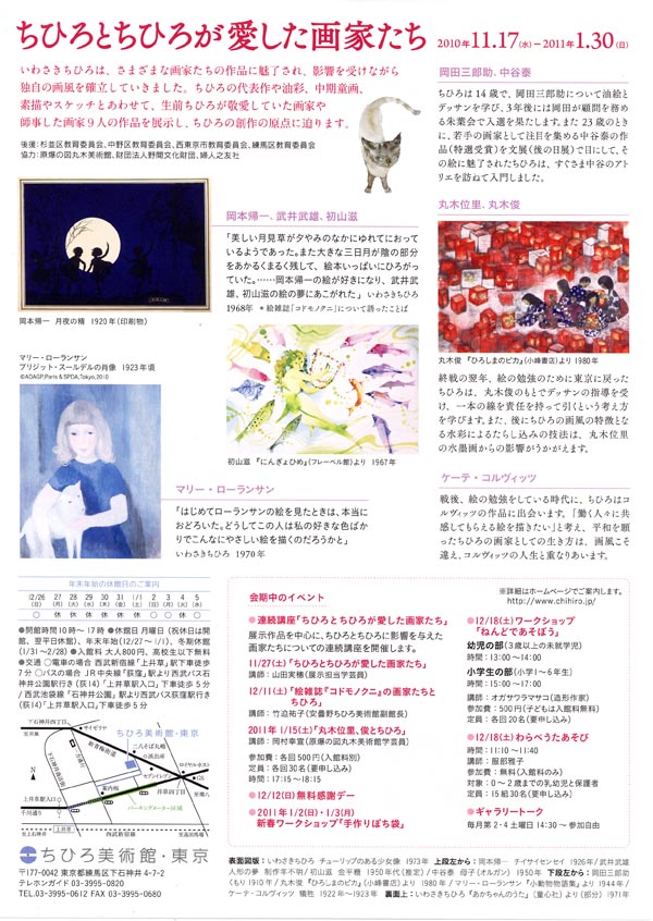 ツリーと言えば「豆本ツリー」。今年も神保町・東京堂書店に、豆本ツリーが置かれます。 豆本ツリーとは、クリスマス・ツリーに、豆本をオーナメントのように吊したもの。欲しい豆本を見つけたら、外してレジに持っていくシステムになっています。 今年は東京堂書店ふくろう店に設置されます。期間は、2010年12月4日(土)~25日(土)。 今年は豆本3冊と豆本立てのセットを出品する予定です。 「羊3部作」と豆本立て。もしくは『トゲなしサボテン』『さん・ちょっと・クッキー』『トランクひとつの本屋』の3冊と豆本立て。 数はあまり作れませんが……。 こんな感じのパッケージを予定しています。 豆本ツリーを見に行かれる方は、見つけてみてくださいね。 豆本のほうは、セット品だけでなく、バラでも出品しようかと考えています。 クリスマス・プレゼントにいかがでしょうか? 今日、ひさしぶりに「ちひろ美術館・東京」に行ってきました。 美術館は、西武新宿線・上井草駅から徒歩10分くらい。実家にいたころは、自転車でも行ける距離だったので、友の会に入って、しょっちゅう行っていました。 中身は、友の会会員だったころに取っておいた、ちひろ美術館のチラシです。 季節ごとに展示内容が変わるので、いつも楽しみにしていました。で、チラシもこうして取っておいたわけです。 一番古いチラシは、1991年のもの。20年近く前になるんですね~。 今回の展示はこちら。 ちひろの絵はもちろんですが、初山滋や武井武雄、岡本帰一などの絵も、少しずつですが飾られていました。初山滋、武井武雄の絵は、シビレます! かっこいい! 面白かったのは、絵本「人魚姫」のコーナーがあったこと。片面の壁には、いわさきちひろの人魚姫が。もう片面には、初山滋の人魚姫が並べられていました。見比べることができて、楽しかったです。 初山バージョンの人魚姫は、下半身の魚部分が、より魚っぽく描かれています。ちょっとマグロを思わせるような感じで、背ビレ、胸ビレのようなヒレの突起が描かれています。 展示が変わったら、また行ってみたくなりました。 ちなみに、次回の展示は『窓ぎわのトットちゃん』だそうです。 Photobackにつきましては、今月19日のブログにもちょっとだけ書きましたので、そちらをご覧ください。 もしくはこちら。 http://www.photoback.jp/ このサイトの「STAGE」という投稿コーナーがありまして、そこで掲載されています。 どうぞ、ご覧ください! こちらです。 http:// 九十九耕一(つくも こういち)