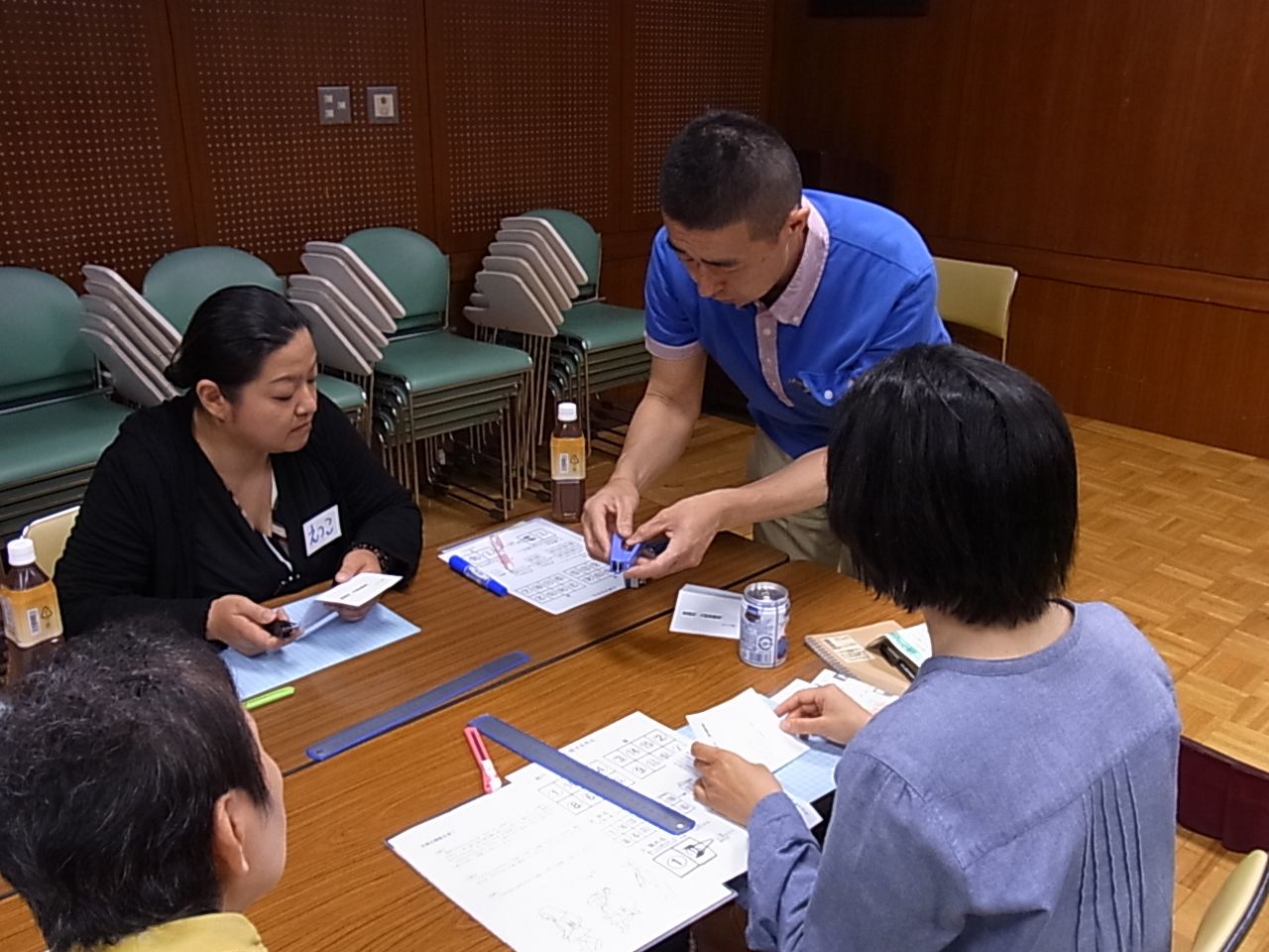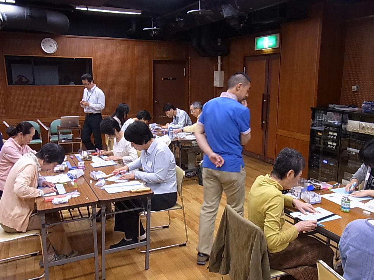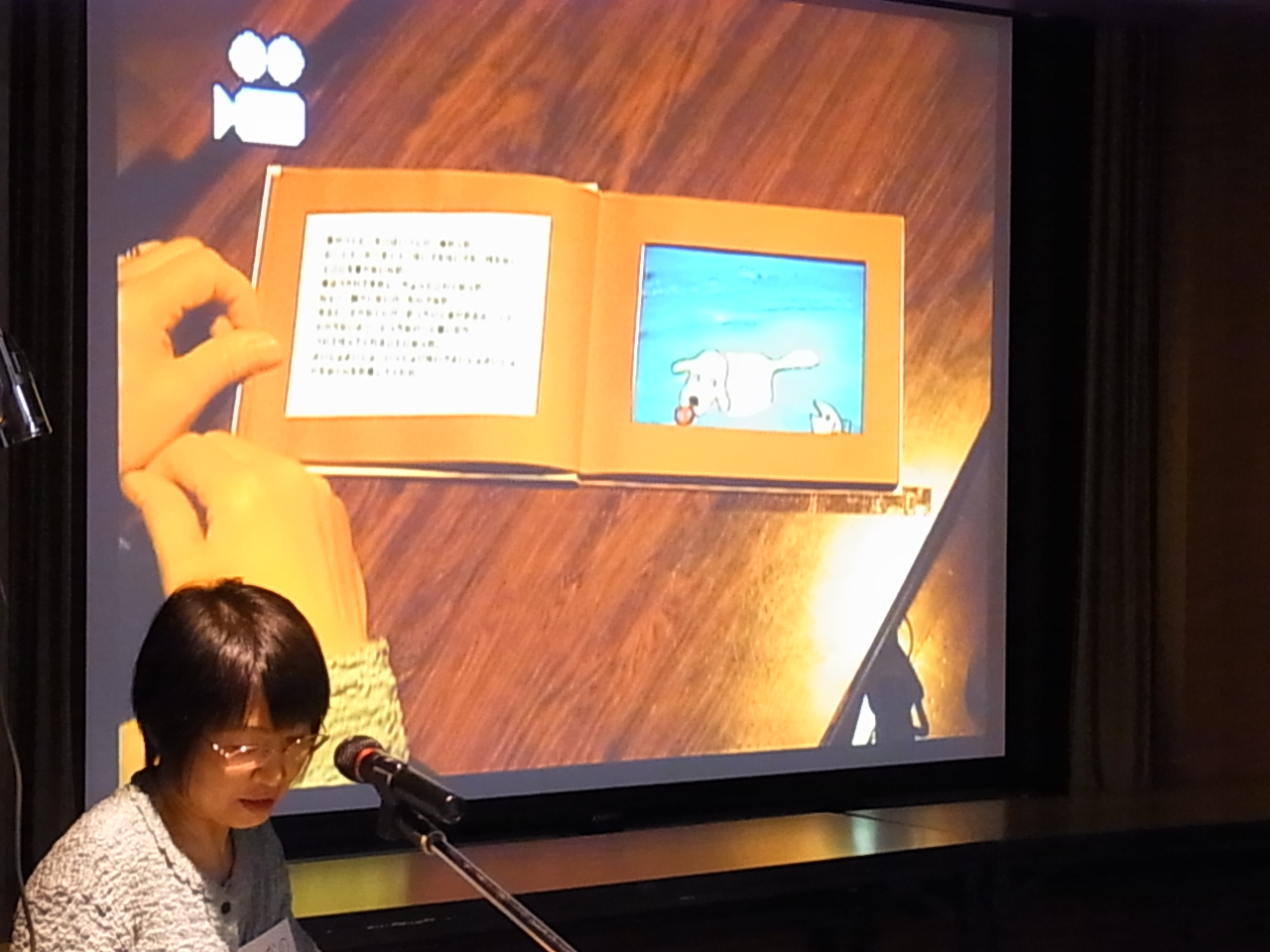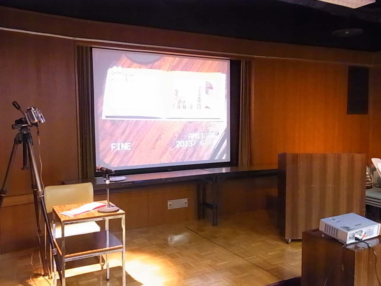 心配だったのは、前回の宿題「お話を書いてくる」「絵、もしくは写真を用意してくる」をできなかった人、持ってくるのを忘れた人がどれだけいるか、ということでしたが……大丈夫でした! 文章がまだ途中という方はいましたが、充分フォローできる範囲内。また、ストーリーは用意してきたけれど、絵が用意できなかったという方もいましたが、スタッフの中に絵の上手な方がいて、イメージを聞き出しながらその場で描くという大活躍をしてくれたので、こちらもなんとかなりました。 前回は講義が中心だったのですが、今回は作業が中心。手順を写真付きで説明したプリントを配り、その場での説明も付け加えながら、作業を進めて行きます。 私が説明を交えながら、実際に作るようすが映し出されます。これにより、各テーブルを回っての説明が大幅にカットされました。ものすごく助かります。 作業の進み具合には、当然のことながら個人差があります。今回は、早い人にはどんどん作業を進めてもらう方式をとりました。 こうしたワークショップで、トラブルはつきものです。ページのつぎ合わせ方を間違えた、写真の順番間違えて貼ってしまった、あとで表紙と本体を合体させるときに糊付けする面を扉にしてしまった等々。 どれも一大事ですが、現場で、どうしたら解決できるかを考えるのも、なんだか楽しかったです。「役立ってる」という実感があります(笑)。 幼児向けの絵本にした人、孫のためのアルバム風にした人、ポエムにした人、縦開きにした人……。どれもこれも、オリジナリティに溢れる作品でした。 マイクも据えて、絵本を画面に映し出しながら朗読をしてもらいました。 どの作品も、とてもおもしろかったです。講評をしたのですが、どんなコメントをしたらいいか悩むような作品はひとつもありませんでした。 どうなることか心配したワークショップでしたが、みなさん、笑顔で帰ってくれたのが嬉しかったです! ご協力くださったスタッフのみなさん、本当にありがとうございます! 私ひとりでは、受講者のみなさんに笑顔を持ち帰っていただくことができなかったかもしれません。みなさんとチームを組めたことに、感謝しています!