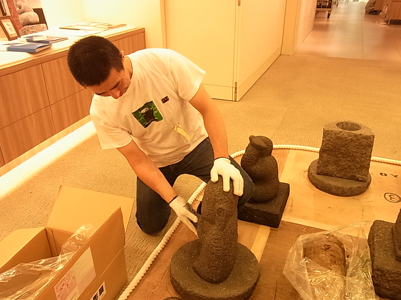 新しいブログは「続・どんぐりも背くらべ」というタイトルです。 http://korukun9951.hatenablog.com/ なお、こちらのブログもこのまま残しておきますので、メールフォームなどもお使いいただけます。 豆本についてのお問い合わせ等にご利用ください。 よろしくお願いいたします。 九十九耕一 PR 浜田さんの作品は、石なのに柔らかみや、暖かさを感じます。 ……とは言うものの、やっぱり重いです(笑)。 前回の搬入の際、ちょっとしたイタズラで、浜田さんの作品の写真を、胸に大きくプリントしたTシャツを着て行きました。「浜田組」なんて文字も入れて。 浜田さんはそれがたいへんお気に召したようで、今回は自ら、お手伝いメンバー全員分のTシャツを用意してきました! それを着ての作業となりました。 浜田さんの今回の作品、こんな感じです。 新宿・小田急本館10階で、18日まで開催。 詳しくはこちらをどうぞ。 http://www.geocities.jp/s_ishibori/event/index.html