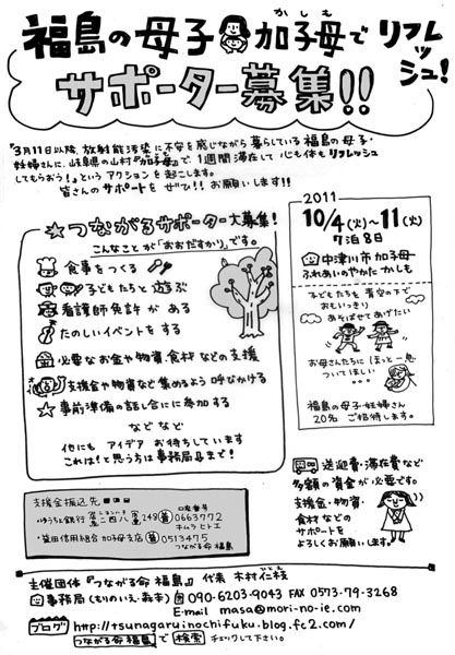 放射能に不安を覚えつつも、福島で暮らしている母子を、1週間、加子母に招いて、気持ちをリフレッシュしてもらおうという企画です。 来月4~11日の企画ですが、7日の夕方、会場の加子母で、つくも堂まめ本舗のワークショップを、夕方から開講します。参加者は福島のお母さんと子どもたち、そして加子母の子どもたち、といったところでしょうか。 福島では不安を抱えながらの生活でしょうが、豆本作りを覚えて、少しホッとしていただけたらと思います。 この企画では、サポーターを募集しています。物資や食料、金銭面での援助をして下さる方、どうぞよろしくお願いいたします。 以下、サイトからの貼り付けです。 「つながる命 福島」サポーター大募集!!! 「福島の母子、加子母(かしも)でリフレッシュ!!」 【サポーター募集!】 3月11日以降、 放射能汚染に不安を感じながら暮らしている母子・妊婦さんに、 「岐阜県の山村『加子母(かしも)』で滞在して、 心と身体をリフレッシュしてもらおう!」 というアクションを起こしました。 つきましては皆さんのサポートをぜひお願い致します。 福島の方は、今私達があたりまえに生活していることができずに、 心にいろんな思いを抱えています。 たくさんの方々に助けて頂く事で、輝く命があります。 送迎の交通費(約40万円)、約1週間の滞在費(約30万円)など、 多額の資金が必要です。 支援金や物資、食材などのサポートをお願い致します。 どうぞ皆様の愛と行動をお待ちしています!!! 【お願いしたいサポート】 ● 食事を作って下さる方(福島の方も一緒に作ってもらいます) ● お母さんの話し相手になってくださる方 ●子どもと一緒に遊んでくれる方 ●看護師免許を持っている方 ●イベントを行ってくださる方 ●必要なお金や物資・食材などを支援して頂ける方 ●支援金や物資などを集めるよう、動いて下さる方 ●事前準備の話し合いに参加して頂ける方などなど ○ 支援金振込先 ・益田信用組合加子母支店 普通 0513475 つながる命 福島 ・ゆうちょ銀行(店名)二四八(ニヨンハチ)普通 0663772 キムラヒトエ ・郵便振替 記号 12480 番号 6637721 キムラヒトエ 詳しくはこちら。 http://tsunagaruinochifuku.blog.fc2.com/blog-category-3.html