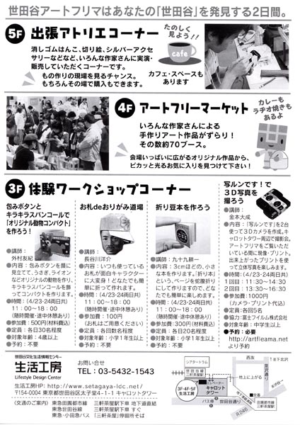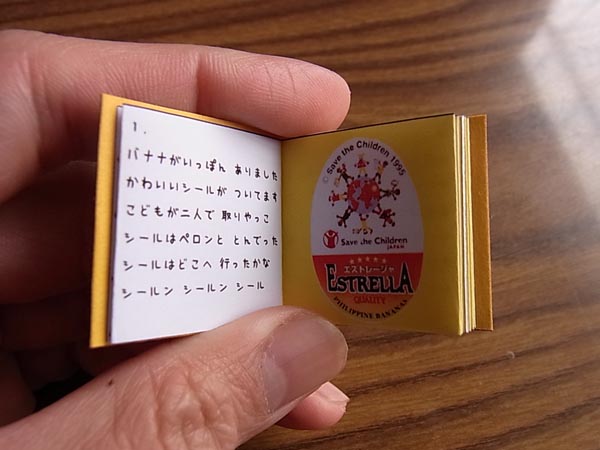 カタクリは、場所によっては、その辺に生えている草みたいですが、練馬区では天然記念物。摘んだりしてはいけません。小学生のころ、押し花で図鑑を作ろうとしたことがありましたが、カタクリだけはスケッチにした覚えがあります。 カタクリの花の時期は、ほぼ桜といっしょ。 今月23日、24日、三軒茶屋・キャロットタワー内で催される「世田谷アートフリマ」で、豆本ワークショップをやります。参加費は300円。 本体を蛇腹に折って作る「折り本」という形式の豆本です。大きさは3cmくらい。 一応「対象年齢・小学1年生以上」となってますが、簡単な作りなので、ハサミが使えれば、もっと小さなお子さんでも参加できます。 表紙に貼ってあるのは「世田谷233」のオリジナル・バナナシール。 世田谷233はバナナ屋さんではなく、ボックスギャラリーです。世田谷アートフリマで、中心となって動いているお店です。別企画でバナナシールを作ったそうで、その在庫を使わせていただきました。まったく偶然のコラボレーションとなりました。 バナナについているシールをプリントしました。隣のページには『とんでったバナナ』の替え歌『とんでったシール』の歌詞が添えてあります。 ご興味ある方、よろしかったら、遊びに来てください。