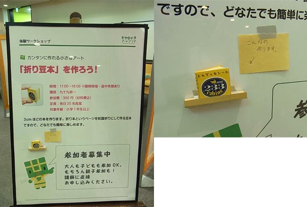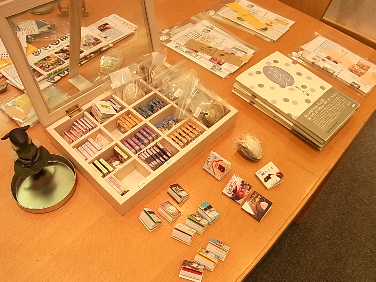 木曜の夜から瞼にポッチリができて腫れはじめました。金曜の午前中、勤務先の人から地元では名医と呼ばれる先生がいる皮膚科を教わりました。相方の仕事は午前中で終わるので、午後から行こうとネット検索してみたところ、なんと金曜は午後休診。土日も休診。 「診てもらうなら、名医がいいよなー」と、しばらくようすを見ることに。 翌土曜、この日も仕事に行った相方だったけれど、もうそよ風が当たっても痛い状態で、腫れもひどい。「これは名医を待っていられない」ということで、土曜の午後も診察している皮膚科を探し、かけ込みました。 「帯状疱疹」との診断を受け、薬も処方してもらったのですが、相方いわく、感じの悪い病院だったそうです。知的障害がある感じの人が助手をしていたそうだけれど、若い医者はその人が要領悪いことをすると「そうじゃない!」と叩くのだとか。この1点を取っても、医者としての器量が知れます。 「次の予約を」と言われたが、相方は「勤務表確認してから連絡する」と言って出てきたそうです。 処方された飲み薬、塗り薬を使い、なんとなく腫れは引いた感じもしなくもありません。しかし、痛みは変わらず。 月曜日、ようやく名医のところへ。おじいちゃん先生で、親切丁寧だったそうです。土曜に処方された飲み薬を見せると「間違ってはいないんだけど、効くのが遅いんだよねー。痛かったでしょう?」と、鎮痛剤を処方してくれました。塗り薬の方は「なんだろう、これ?」と、看護士さんに調べてもらったとか。どういう薬かはわかったものの「この薬でいいんかいな?」みたいな感じで、これ別の薬を使うことに。 「目の周りが心配だから、眼科を紹介してあげるね。でも、紹介状書くとお金がかかっちゃうから、口頭で、私の紹介だって言えば大丈夫だからね」と、にこやかに言ってくれたそうです。ウイルスが視神経に入ると、相当まずいことになるようです。 その後、別室で看護士さんからマンツーマンで帯状疱疹の説明を15分くらい受けたそうです。安静にすること。子供に接しないこと。 帯状疱疹は水疱瘡ウイルスなので、まだ水疱瘡にかかっていない子供と接すると、移してしまう可能性があります。こんな大事なことを、最初の病院では教えてくれませんでした。 診察終わり、眼科へ。「はいはい、あの先生の紹介ですね」と、すんなり通じて診察。ウイルスは視神経には入っていないということで、ひと安心。しかし、目の周りの水疱には、充分気をつけないといけません。水疱が潰れ、液が目に入ると、最悪の場合、角膜移植するしかなくなるとのこと。恐ろしいです。 痛くても触ってはいけない。眼帯も、水疱を潰す危険があるので、できない。本当にやっかいです。目薬2種を処方してもらいました。 ショックなことが、ひとつ判明。名医の病院、金曜の午後も診察してるし、土曜も2時まで診察しているとのこと。ネットの情報は古かったのか、そもそもぜんぜん違っていたのかは分かりません。最初から名医のところに行けばよかった~! みなさん、ネットで病院を検索して「休診」となっていても、とりあえず、電話して確認しましょう! 今回、豆本ワークショップのお客さんは、前回と比べると1.5倍! とくに初日は11時の開始と同時にお客さんが来てくれて、そのまま17時半ごろまで途切れ無し。お昼ご飯はもちろん、トイレにも行けないくらい忙しかったです。忙しいのは「たいへん!」という面もあるけれど、「嬉しい!」という気持ちの方が大きいです。 なにせひとりでやっているので、販売の方も見なければならいのが、忙しさの一因か。そんなには売れなかったけど。 けれど、看板だけだと、豆本がどんなものかが伝わらないので、いつも見本を出しておきます。ふらりとやってきたお客さんが「お? なんだ、これ?」と手に取れるように。 ときどき「ちっちゃ~い!」という声が聞こえてくるので、手が空いているときは「どうぞ、こちらにも置いてあるので、ごらんくださーい」と販売コーナーに誘導してます。 今回はアートフリマスタッフの方が、ほとんど付きっきりでお客さんに案内してくれたので、ワークショップに専念しましたが。 豆本ができあがったときの子供の笑顔は、本当に嬉しいものです。もちろん、大人の笑顔も嬉しいですよ~。 ズボンの裾も濡れていたのですが、さすがにズボンを脱いで干しておくのははばかれます。 そんな中でも、たくさんのお客さんが来てくれて、ありがたいことです。 コヤナギさんは私の豆本・羊三部作のカバー写真に使った羊人形を作ってくれた作家さんです。ジェイムズという名前の羊ですが、今回はジェイムズも店番として連れて行きました。 お客さんに「この子を作った作家さんは、今あそこでワークショップやってまーす」なんて具合に話しました。ジェイムズ、今回はけっこう活躍てくれました。 コヤナギさんのブースも毎回満員で、とっても楽しそうでした。 ブー