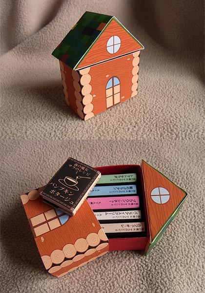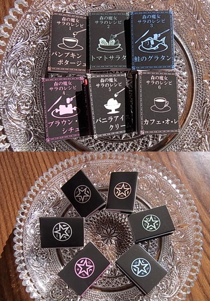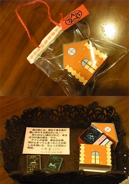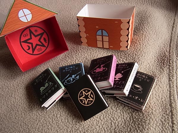 今日から25日まで、神田神保町・東京堂書店3階に、豆本ツリーが設置されます。ツリーに、オーナメントのように豆本が吊され、気に入った豆本は購入することもできます。 今回は私を含め、16名の豆本作家が参加しています。 今回のつくも堂まめ本舗の作品はこちら。 以前、ストーリーゲートの宣伝企画として『小さな魔女・サラのレシピ』というシリーズを書いていました。第5話まで書いたところで企画が終わってしまい、未完のままになっていたお話ですが、今回『森の魔女・サラのレシピ』と改題し、最終話を書き、すでに書いていたお話も加筆訂正して、全6巻の豆本にしました。 表紙は料理の絵、裏表紙は魔法陣になっています。 主人公のサラは、森の奥、小川のほとりの丸太小屋に住んでいるので、丸太小屋の箱です。 マッチ箱ののように引き出すと、中に豆本が収まっています。 さて、この丸太小屋、どこかにハートマークが描かれています。目立たないように描いてあるので、パッと見ただけではわかりません。東京堂書店に行かれたら、探してみてくださいね。 豆本を全部出すと、箱の底には、裏表紙と同じ魔法陣が描かれています。 下の写真は、ツリー付近に置かれる見本。たぶん、こんな感じで見本が置かれるので、行かれた方は、どうぞお手に取ってご覧ください。 全6巻のタイトルは、下記の通りです。 1 パンプキンポタージュ 2 トマトサラダ 3 鮭のグラタン 4 ブラウン・シチュー 5 バニラアイスクリーム 6 カフェ・オ・レ 全6巻、箱付きで3200円となっております。 今回、9部しか作れなかったので、売り切れの際はご容赦ください。 東京堂書店はこちらです。 http://www.tokyodoshoten.co.jp/floor/
