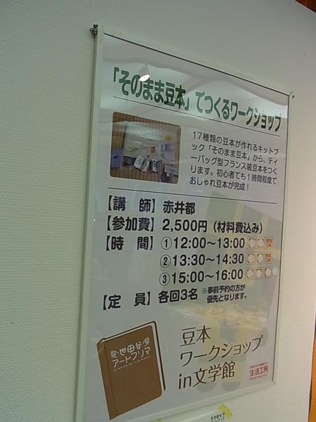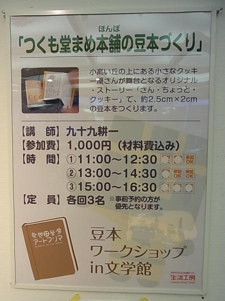 参加費1000円。ドールハウスサイズの豆本『さん・ちょっと・クッキー』を作るワークショップです。 小学4年生以上の方なら、どなたでも参加できます。「4年生以上」というのも、カッターを使うため、一応設けた目安です。保護者の方がつきそってくだされば、4年生に満たなくてもご参加いただけます。 道具は会場に用意してありますので、手ぶらで参加できます。 詳細、ご予約はこちらから。 http://artfleama.net/setabun/setabun2010ws/#extended |
