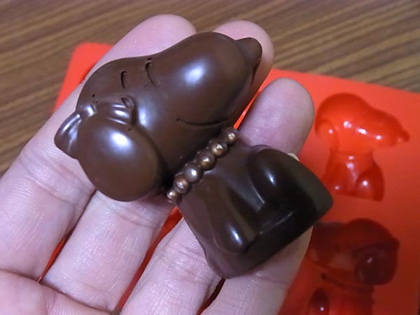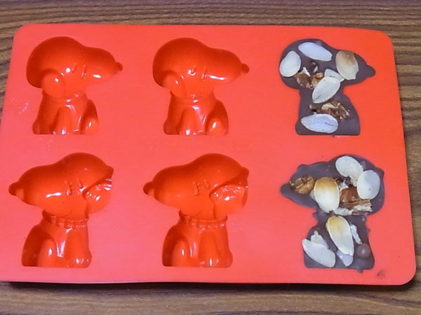 たまたま板チョコがあったので、溶かして、流し入れてみました。 これまた、たまたまあったピーカンナッツとアーモンドスライスも入れてみました。 冷やし固めて、型から出してみると…… スヌーピーには、ベルという姉だか妹だかがいるそうです。そっくりですが、リボンとネックレスをつけているのがベル。 型のネックレス部分のくぼみに、アラザンを置いてからチョコを流し込んだので、真珠のネックレスっぽくなりました。 今度は焼き菓子も作ってみたいと思います。 よかったらこちらもご覧くださーい! http://www.muteppo.net/