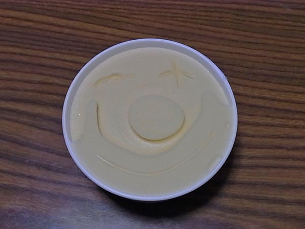 復興は、元通りにするのではなく、いろいろ正していくことを望みます。例えば電力についても、「必要だからどんどん作らなくちゃ」ではなく「これしかないのだから、うまく分けて使おう」という具合に。 原子力発電所の事故のことを思えば、節電を心がけることは、なんでもないことです。 話は変わりまして。 私も経験がありますが、熱があるときのアイスは、ものすごーくおいしいです。 カップアイスのフタを開けると、フタ裏側にアイスの表面がくっついてできた模様があります。私はときどき、この模様を利用して顔を描きます。模様は毎回違うので、あるときは横顔に見えたり、あるときは髪型に見えたりします。 今回はピエロの鼻と口に見えました。スプーンで描き足して、できあがり。