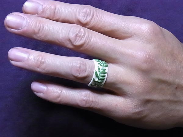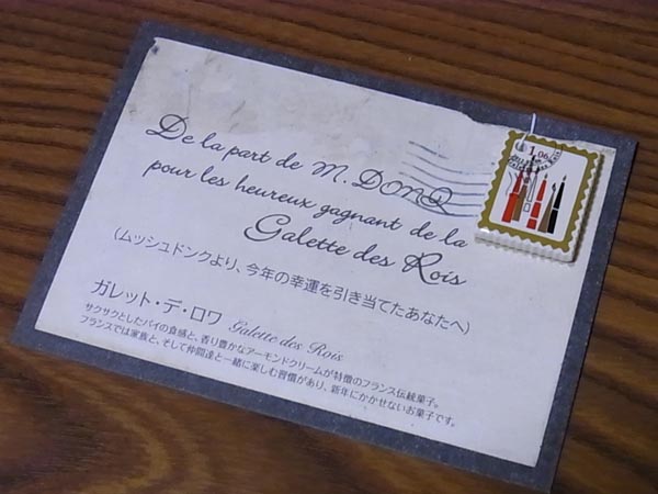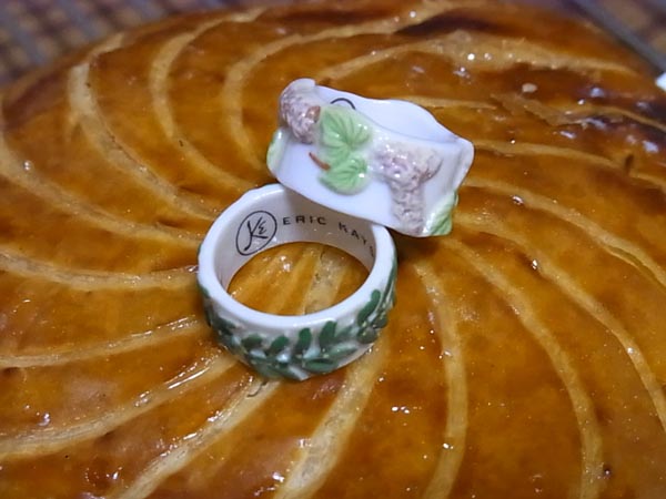 ジョアンのほかに「ドンク」と「メゾンカイザー」のガレット・デ・ロワも、毎年買っています。 ドンクのフェーヴは、毎年切手型。 ハガキ状の台紙につけられていて、かわいいです。 メゾンカイザーのガレット・デ・ロワのありがたいところは、小さいサイズも販売しているというところ。ちょっと値上がりしてしまい、「ショコラ味」がなくなってしまったのは残念です。値上げは、いろいろ材料が値上がりしたから、仕方ないですよね。 フェーヴが2個あるのは、小さいサイズを2個買ったからです。指輪フェーヴ、何種類あるんでしょうか? 内側には店名もプリントされています。 切り分けられたガレット・デ・ロワから指輪が出てきたら、はめてみますよね~。 さあ、指輪フェーヴの入ったガレット・デ・ロワを選んだのは、誰かな~? ……いや、そんな深刻な顔しなくても、指輪を捨てる旅には出なくていいですから! むしろ、捨てずに、大切にして下さいな。