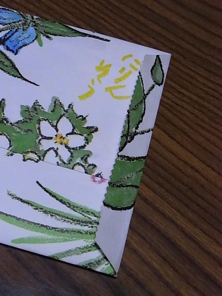 × [PR]上記の広告は3ヶ月以上新規記事投稿のないブログに表示されています。新しい記事を書く事で広告が消えます。 私はよく、買い物先でもらう紙袋や包装紙で、オリジナルの封筒を作ります。ときどき「どうやって作るの?」と聞かれることがあるので、作り方を紹介しますね。いつも適当に作っているので「教える」というようなことはできませんが、ざっくりとした作り方の紹介です。 袋中央の「はまなし」の絵を中心に、封筒を作っていくことにします。 本体の方まで薄く剥がれてしまうこともありますが、そのくらいは気にしなくて大丈夫。封筒にしてしまえば、内側は見えませんから。もし破れてしまっても、その部分を使わないように作っていけばOK。 封筒には規定の大きさがあります。最大で23.5cm×12cm、厚みは1cmまでで、総重量50g以内だと、80円切手を貼れば送ることができます。それ以上になると定形外郵便となり、料金が変わってきます。最低でも120円かかります。 小さすぎてもいけなくて、最小は14cm×9cmです。 合わさる部分は1cmくらいあれば充分です。1cm以上の部分が余分となります。今回は左側のあわせに余分ができました。折り込んでいるのが余分ですが、この写真だとわかりにくいですかね? すみません。 左右両側に余分ができることもあります。余分は切り落とします。 広げると、下の写真のようになります。 三角の切れ込みの頂点を起点に、両端を切り落とします。 このとき、折り目に沿ってまっすぐ切るのではなく、少し内側に、斜めになるように切り落とすのがポイントです。こうしておくと、封筒のフタの部分を折り返すときに、折りやすいですよ。 両端を斜めに切り落とし、三角の切れ込みの頂点を起点に、斜めに両端を切り落とします。底のときと、まったく同じ作業ですね。 あとはのり付けをすれば、封筒のできあがり。のり付けの際、うっかり封筒のフタまで閉じてしまわないように。中身が入れられなくなりますよ! このようにギザギザを残すのも、ポイントになってかわいいと思いませんか? 同じ紙を使っても、レイアウトの仕方で表情が変わってきます。これも、封筒作りの楽しみですね。 残りの紙で、封筒をもうひとつと、ポチ袋も作りました。もうひとつの封筒は、横長にしてみました。封筒の表情、変わるでしょう? これを郵便として出すときは、宛先を別紙に書いて、貼りつけています。柄に白い部分が大きくあれば、直接書いてもいいのですが、今回のように全面に絵がある場合は、別紙を貼ったほうがいいでしょう。宛先がどこに書いてあるのかわからないと、届かないおそれがありますから。切手を貼る場所も、絵の中に埋もれてしまわないよう気をつけて。 ちなみに私が宛先を貼りつける場所は、封筒の裏側です。宛名を貼りつけた時点で、こちらが「表」になるのかな? なんにしろ、せっかく選んだ絵柄が、宛名で隠れてしまうのはイヤですよね~。 封筒作りの参考になりましたでしょうか? 基本的にはこんな感じです。あとは使う紙によって、創意工夫を楽しんでくださいね~。 PR
